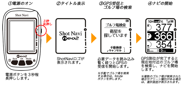 電源ボタンを約3秒ほど押し続けると「Shot Navi」のロゴが表示されます。(電源ボタンを押した瞬間液晶画面のバックライトが表示されますが、そのまま押し続けます)その後、システムが起動し完了すると、自動でGPSの受信を開始しGPS補足後後ゴルフ場を検索します。