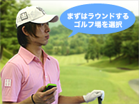 電源を入れ「ゴルフ ナビ」画面からゴルフ場を選択します。GPSで自動コース検索、もしくはエリアから選択も可能です。