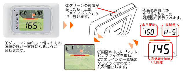 ●現在地点の登録および飛距離の計測を行うには、サブ(電源)ボタンを1回押します。地点登録後3秒おきに残距離と飛距離が交互に表示されます。●スコア入力を行うには、サブ(電源)ボタンを2回押します。スコアはメインボタンでカウントアップ、サブボタンでカウントダウンします。