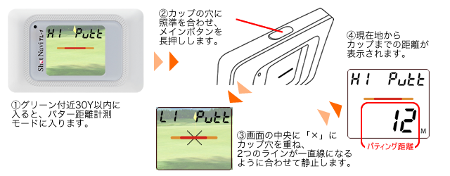 グリーン付近30Y以内に入るとパッティング距離計測モードになります。パッティング距離を測るには、ボール位置に立ち、カップに本機の液晶画面を向けメインボタンを長押しします。照準の「×」が表示されるので、照準と液晶のラインが一直線になるように照準を合わせます。